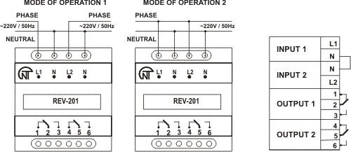 The electronic two-channel time relay with switching delay REV-201 is designed for switching electrical circuits of 220 V / 50 Hz AC and 24-100 V DC with an adjustable switching delay from 0 to 220 s.