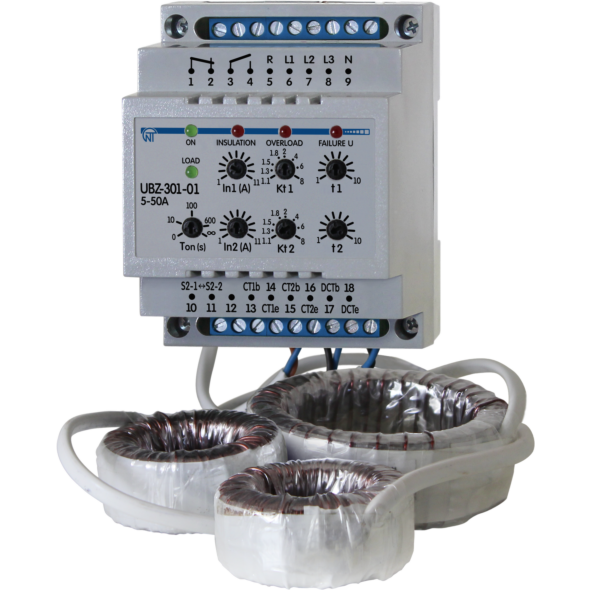 The universal motor protection unit UBZ-301-01 (5-50A) is designed to protect two-speed (two-winding) asynchronous motors, continuously monitor the mains voltage parameters, the current values of the phase/line currents of each winding and check the insulation resistance of the stator windings of the motors to the housing.