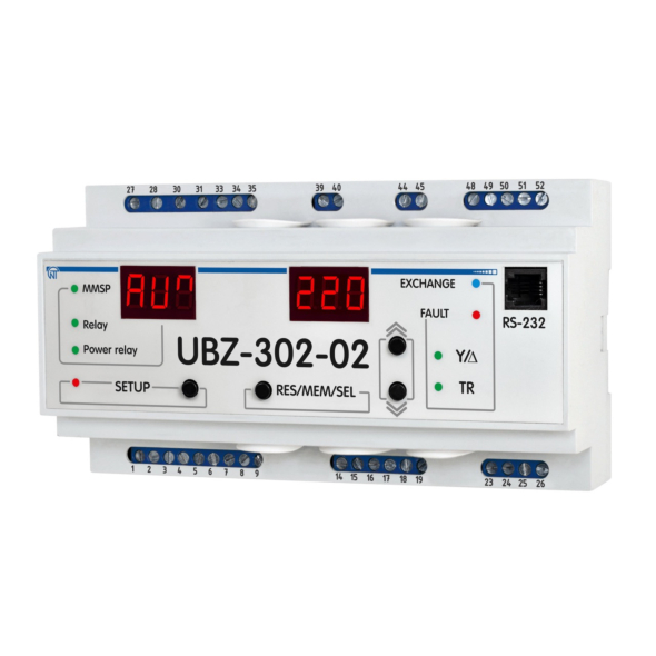 The universal motor protection unit UBZ-302-02 is designed for continuous monitoring of mains voltage parameters, current values of phase/line currents of three-phase electrical equipment 400 V, 50 Hz and checking the insulation resistance of electric motors.