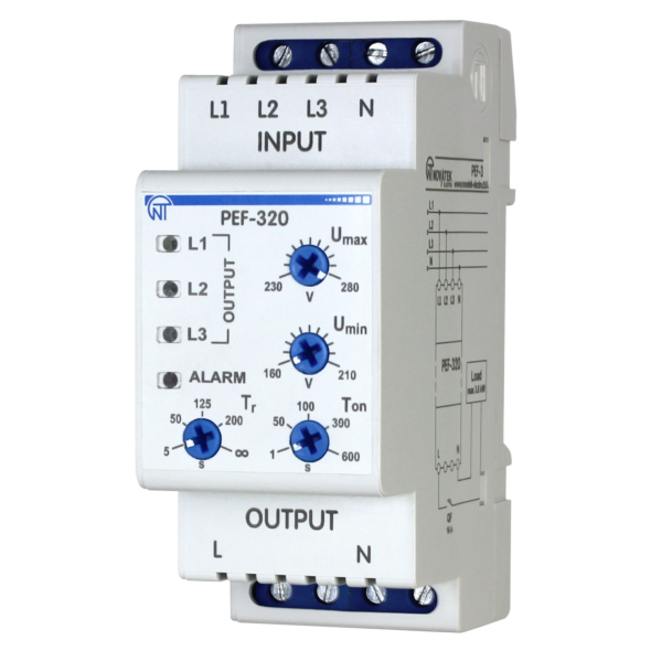 The universal automatic-electronic phase switch PEF-320 is designed to supply power to industrial and household single-phase loads rated for 230 V, 50 Hz from a three-phase power supply network (3x400 V + N). The device ensures uninterrupted power supply to critical single-phase consumers, protecting them from hazardous voltage fluctuations in the power grid.
