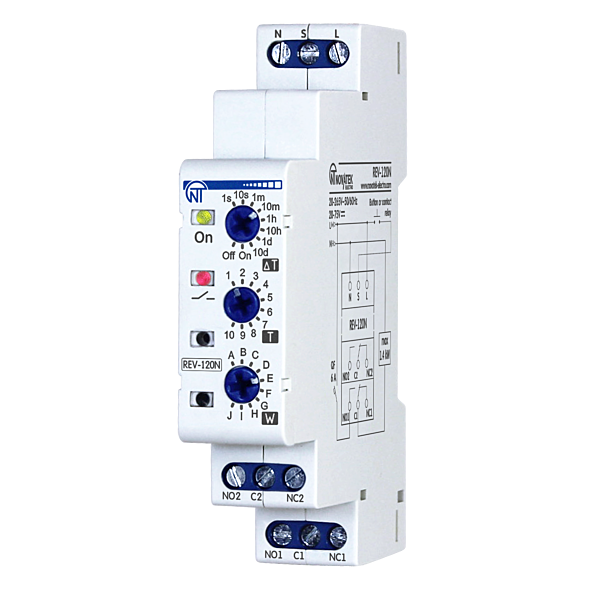 The REV-120N time relay is a microprocessor-based device designed to switch the load on and off at user-defined intervals.
