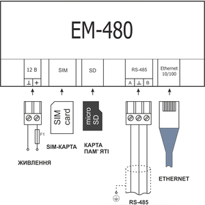 EM-480 забезпечує збір даних з підключених пристроїв MODBUS, передачу даних на сервер, доступ до даних (за протоколом MODBUS TCP або за допомогою текстових повідомлень SMS), відстеження подій і реакцію на події (відправлення SMS-сповіщень, запис значень у пристрої MODBUS).