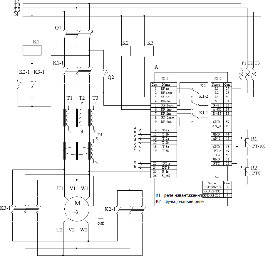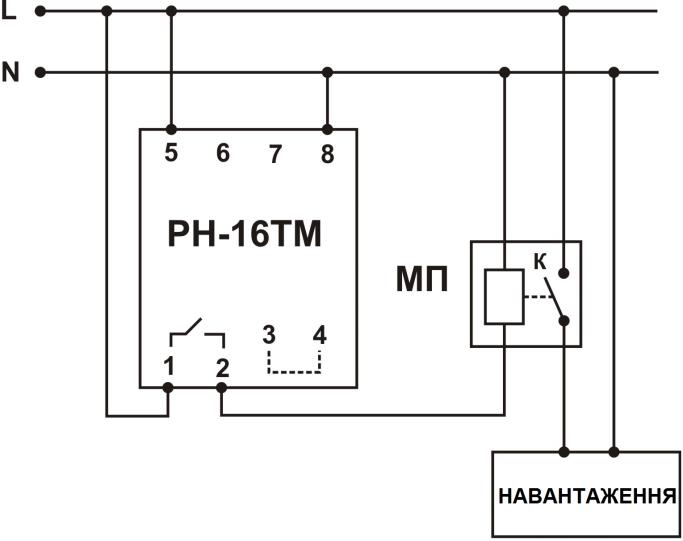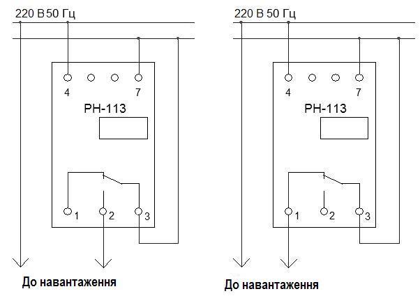 При потужності навантаження до 7,0 кВт (струм до 32 А) відключення відбувається безпосередньо РН-113, вихідні контакти якого включені в розрив живлення навантаження.