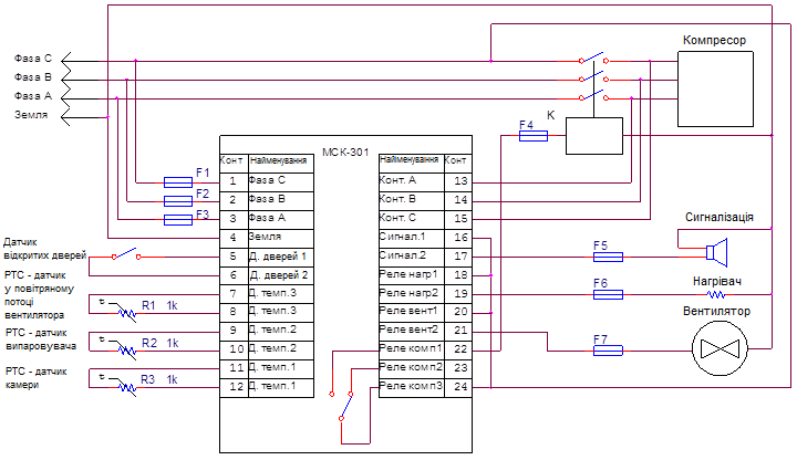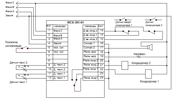 контролює справність і керує роботою двох незалежних кондиціонерів